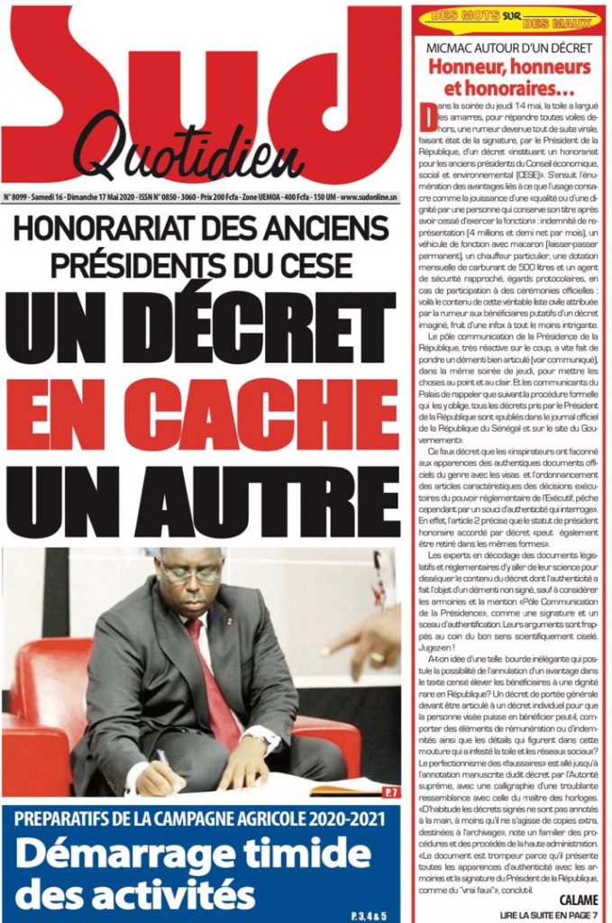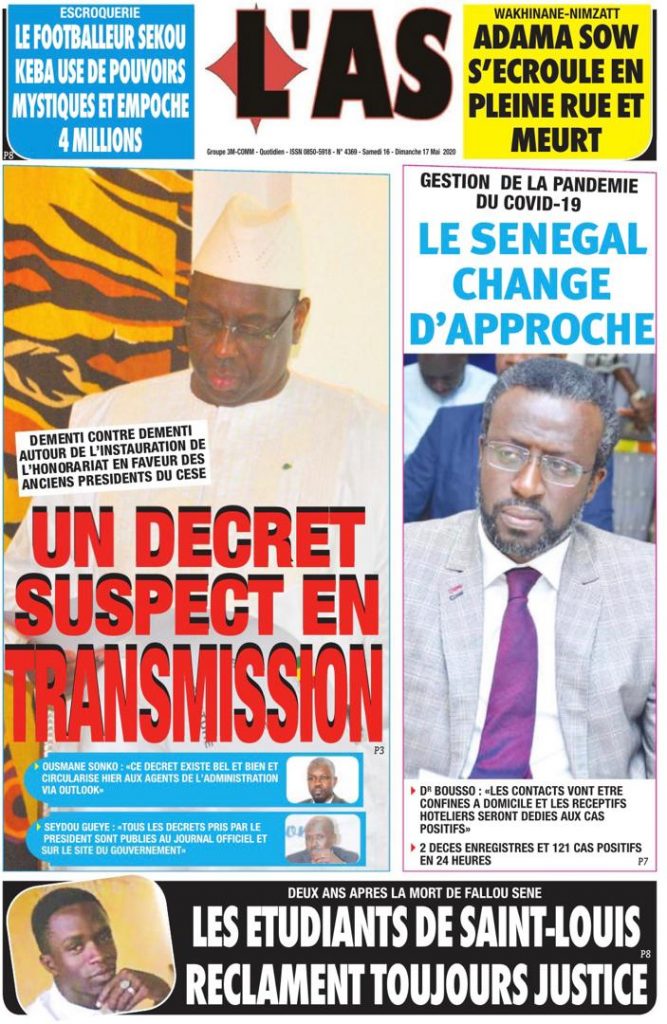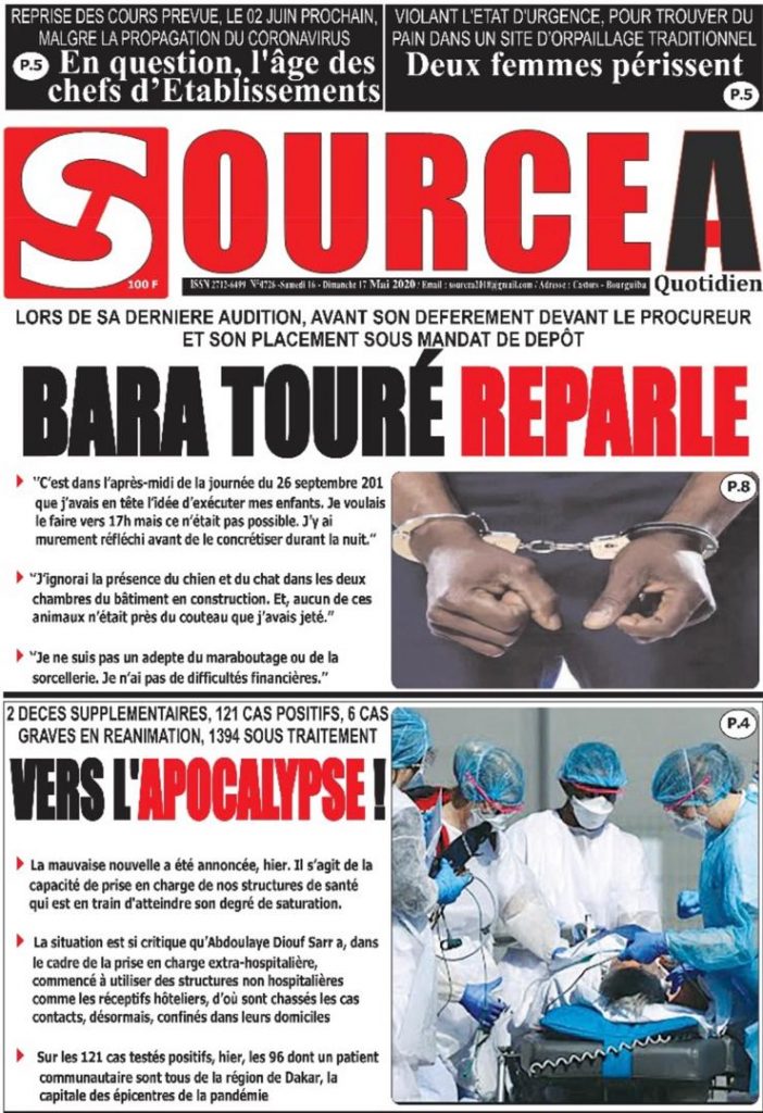 " /> La Une des quotidiens du Samedi 16 Mai 2020 Publié le 16 Mai, 2020 À DÉCOUVRIR Les Unes des quotidiens nationaux du 03 novembre 2025 3 Nov, 2025 Source : Ma Revue de presse par Mamadou Ly – rp221.com Partager ->
