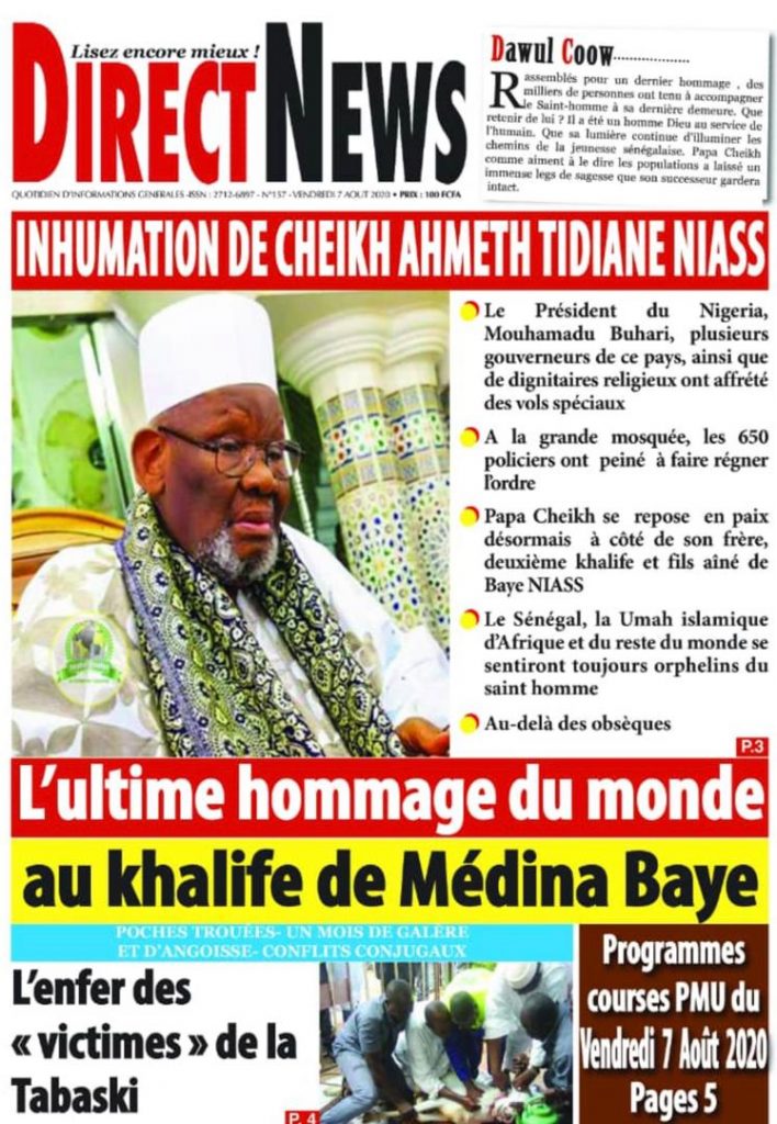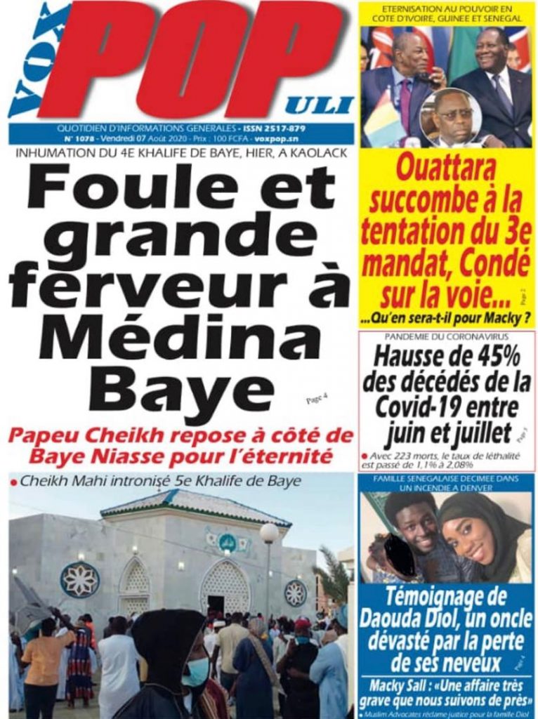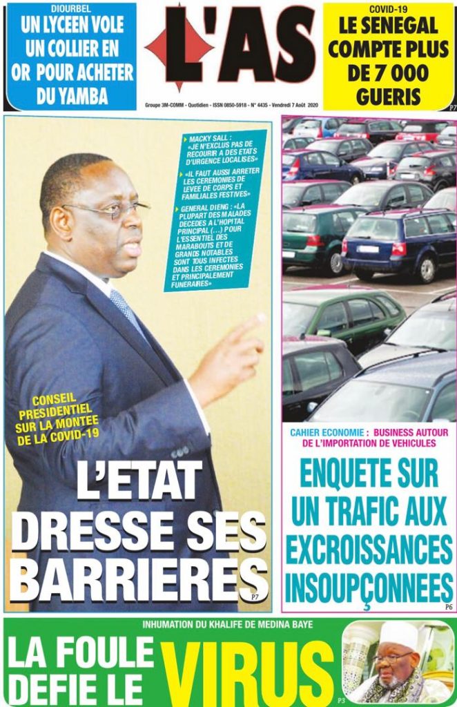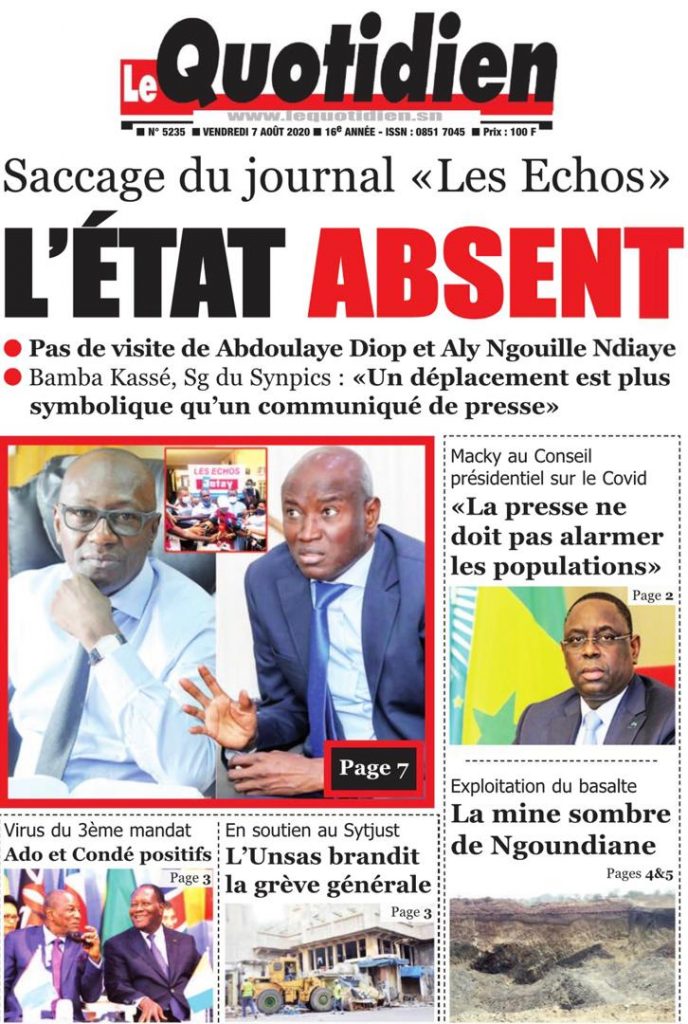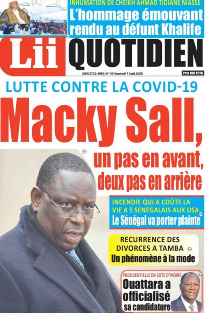 " /> La Une des Quotidiens du Vendredi 07 Août 2020 Publié le 7 Août, 2020 À DÉCOUVRIR Les Unes des quotidiens nationaux du 05 novembre 2025 5 Nov, 2025 Source : Ma Revue de presse par Mamadou Ly – rp221.com La Une des Quotidiens Internationaux du Vendredi 07 Août 2020 Partager ->