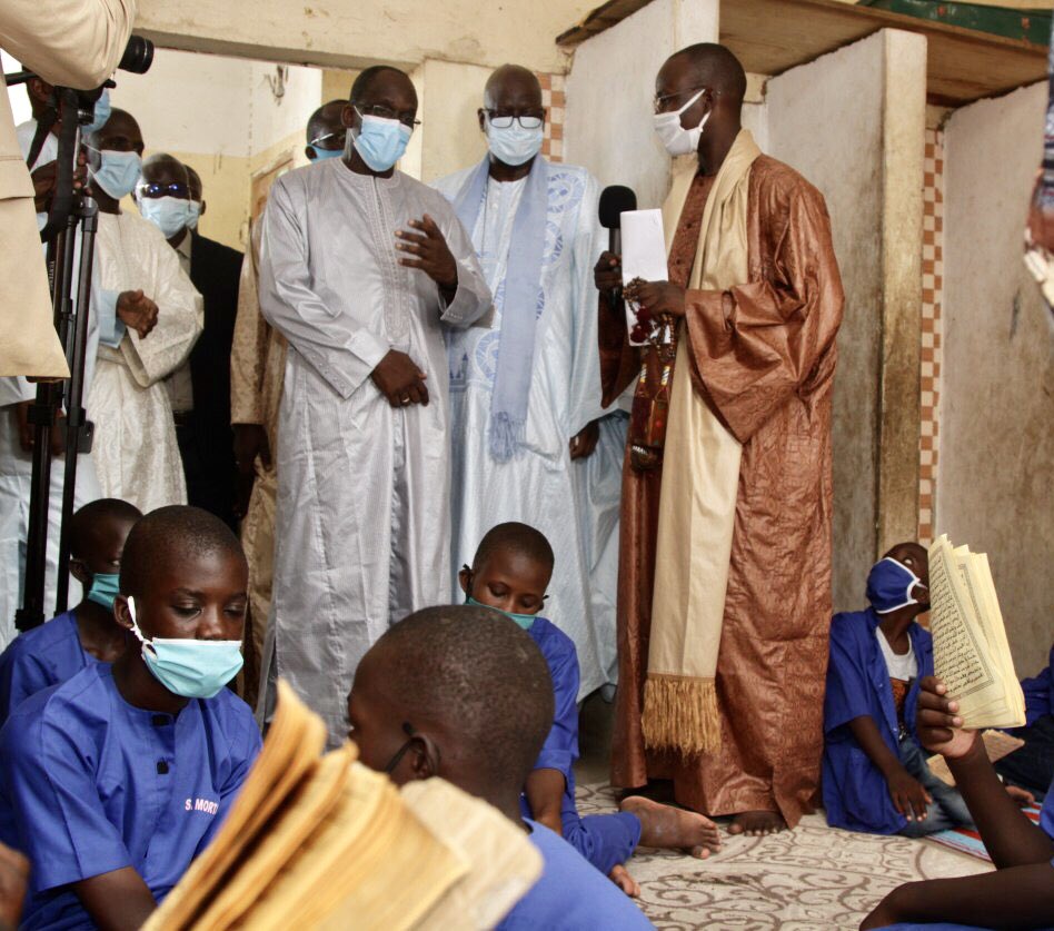 Le Ministre, qui a remis un important don composé de masques, de gel hydrologique, de sacs de riz, de savons et de matelas , a eu l’agréable surprise de recevoir du responsable du daara , Serigne Falilou Sohibou, un exemplaire du Saint Coran, un tapis de prière, et 2 distributeurs de gels fabriqués par les élèves du daara.
