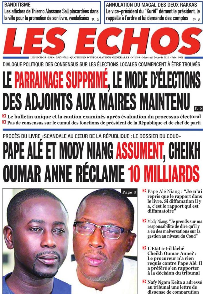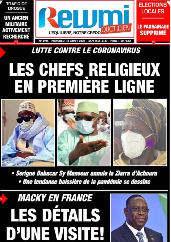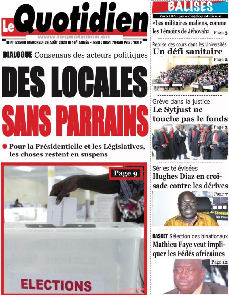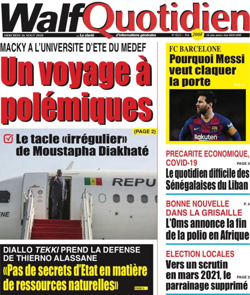 " /> La Une des Quotidiens Nationaux du Mercredi 26 AOût 2020 Publié le 26 Août, 2020 À DÉCOUVRIR Les Unes des quotidiens nationaux du 03 novembre 2025 3 Nov, 2025 Source : Ma Revue de presse par Mamadou Ly – rp221.comLIRE AUSSI La Une des Quotidiens Internationaux du Mercredi 26 Août 2020 Partager ->
