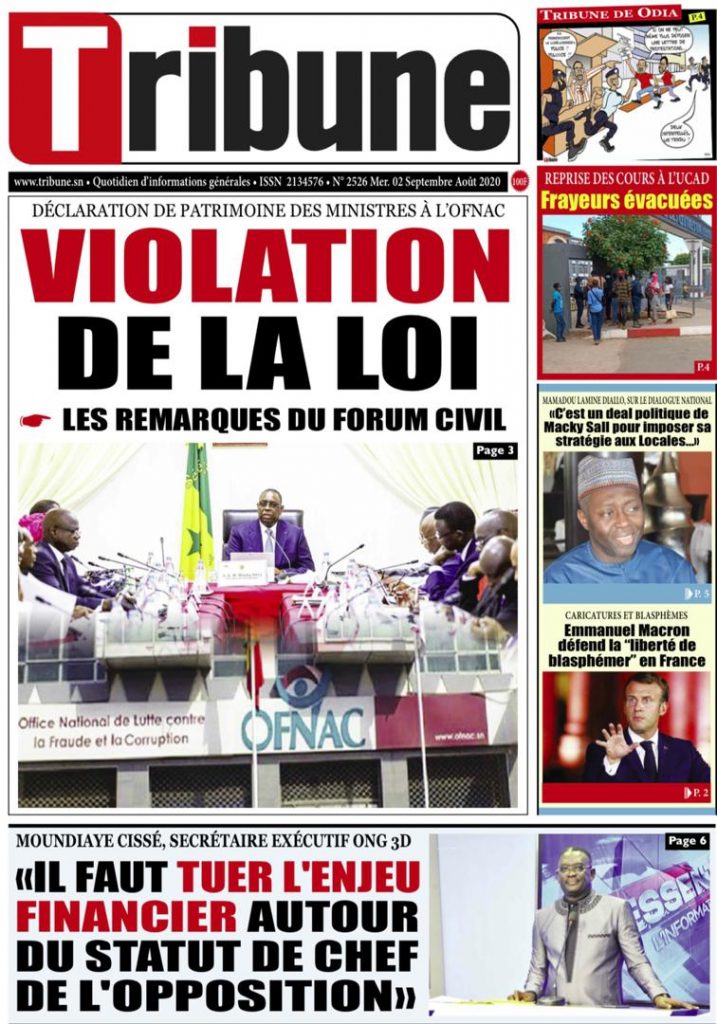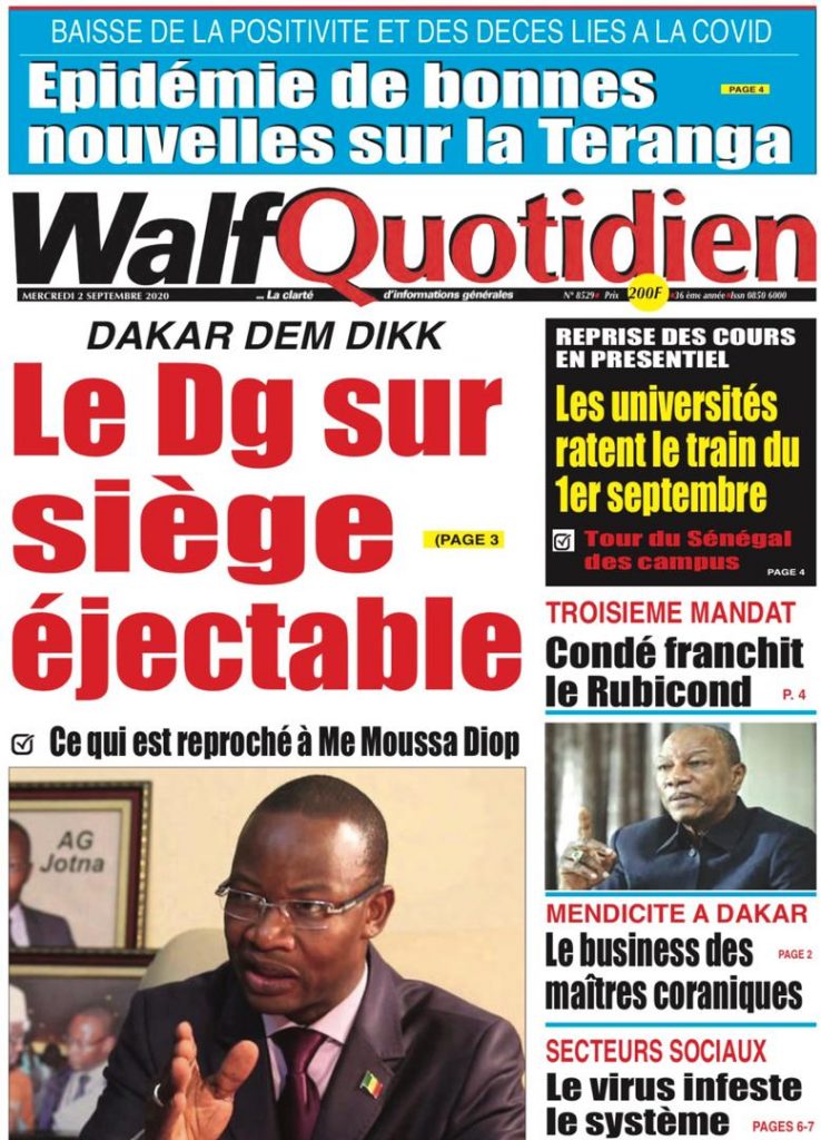 " /> La Une des Quotidiens Nationaux du Mercredi 02 Septembre 2020 Publié le 2 Sep, 2020 À DÉCOUVRIR Les Unes des quotidiens nationaux du 03 novembre 2025 3 Nov, 2025 Source : Ma Revue de presse par Mamadou Ly – rp221.comLIRE AUSSI La Une des Quotidiens Internationaux du Mercredi 02 Septembre 2020 Partager ->