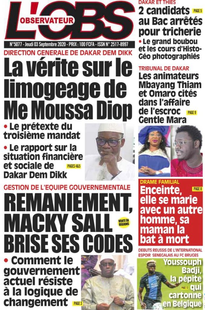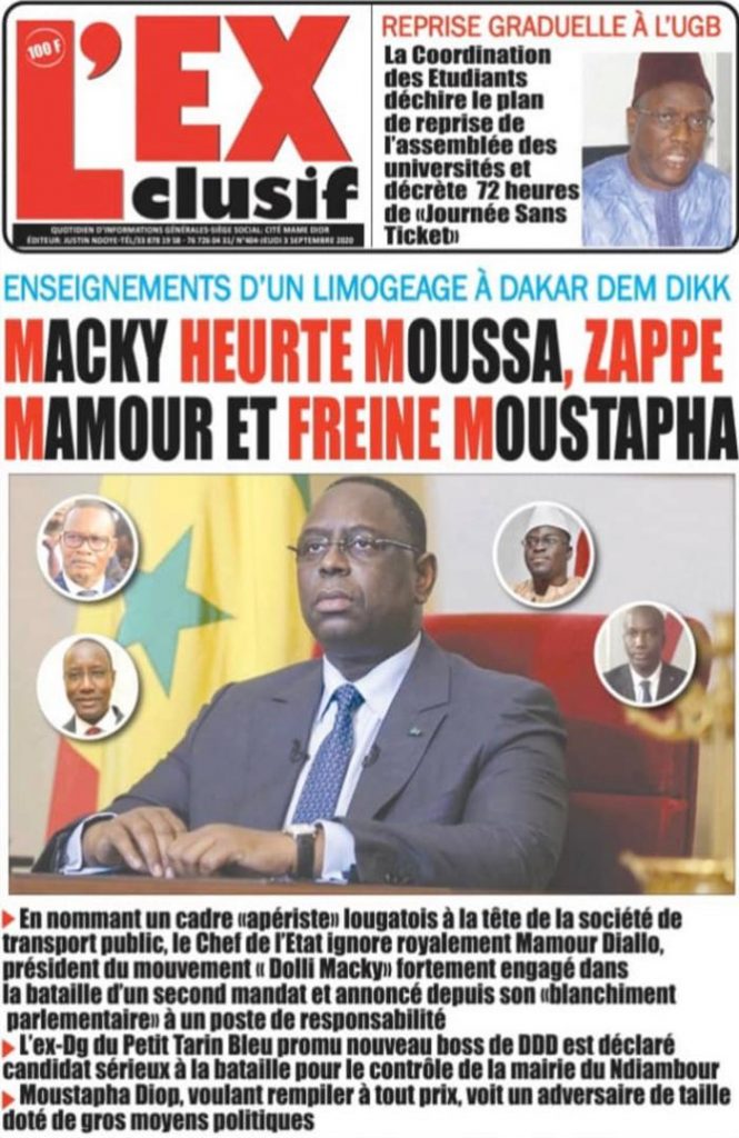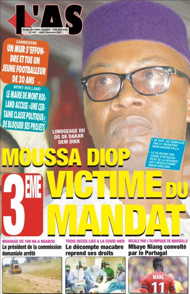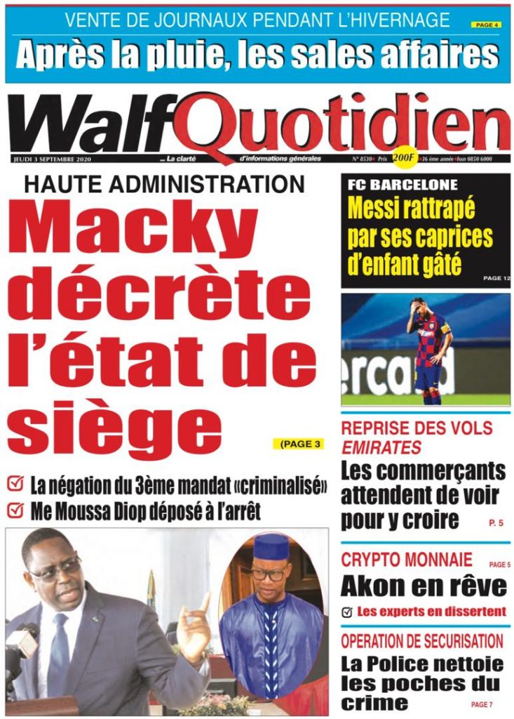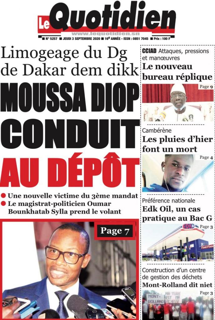 " /> La Une des Quotidiens Nationaux du Jeudi 03 Septembre 2020 Publié le 3 Sep, 2020 À DÉCOUVRIR Les Unes des quotidiens nationaux du 03 novembre 2025 3 Nov, 2025 Source : Ma Revue de presse par Mamadou Ly – rp221.comLIRE AUSSI La Une des Quotidiens Internationaux du Jeudi 03 Septembre 2020 Partager ->