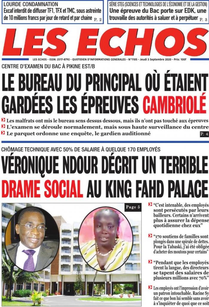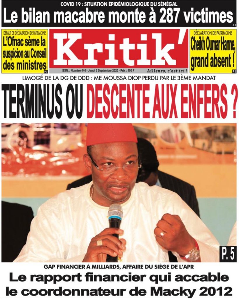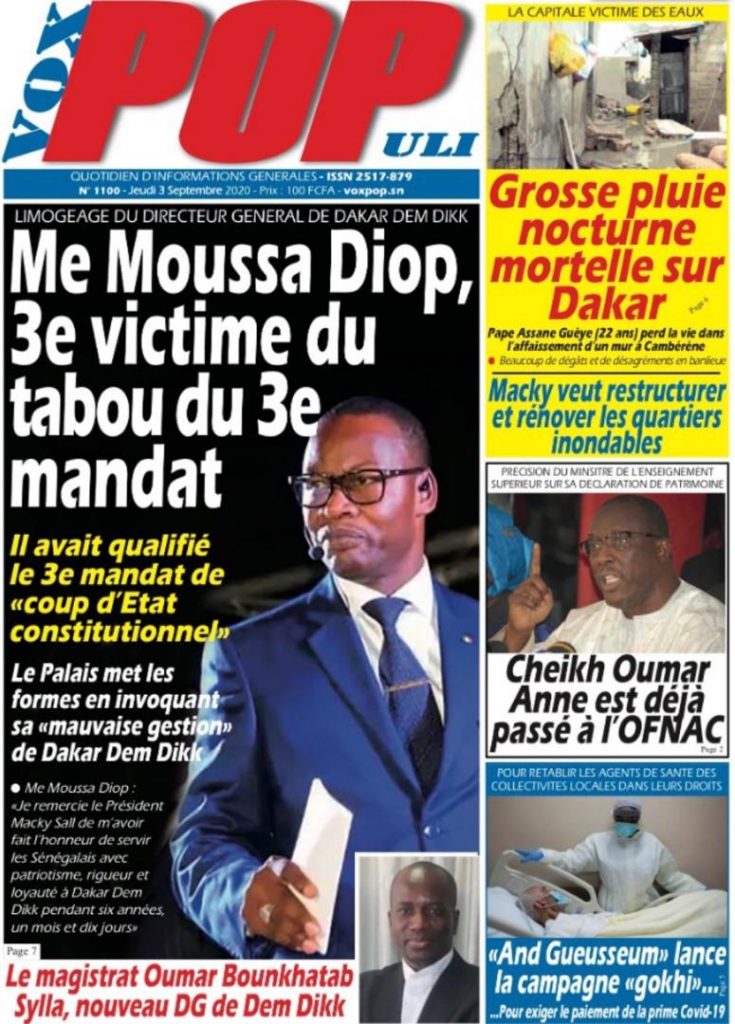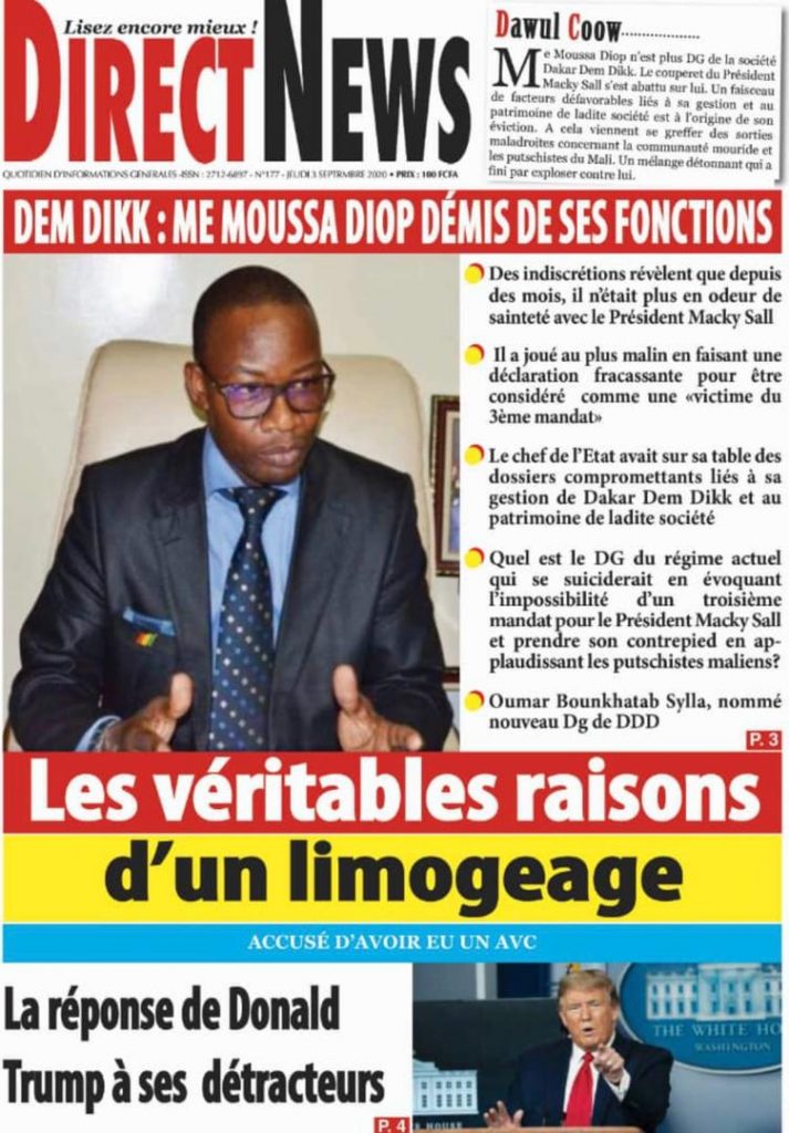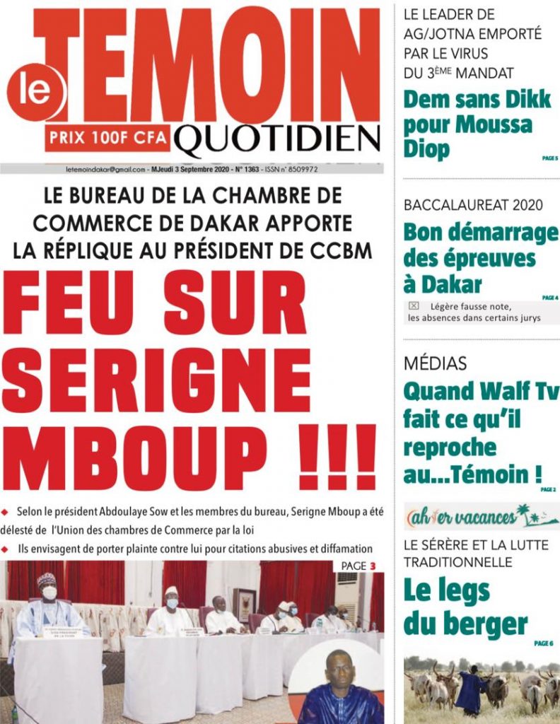 " /> La Une des Quotidiens Nationaux du Jeudi 03 Septembre 2020 Publié le 3 Sep, 2020 À DÉCOUVRIR Les Unes des quotidiens nationaux du 03 novembre 2025 3 Nov, 2025 Source : Ma Revue de presse par Mamadou Ly – rp221.comLIRE AUSSI La Une des Quotidiens Internationaux du Jeudi 03 Septembre 2020 Partager ->