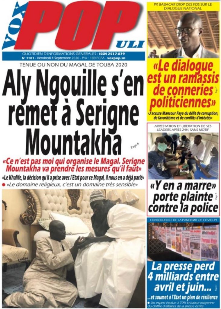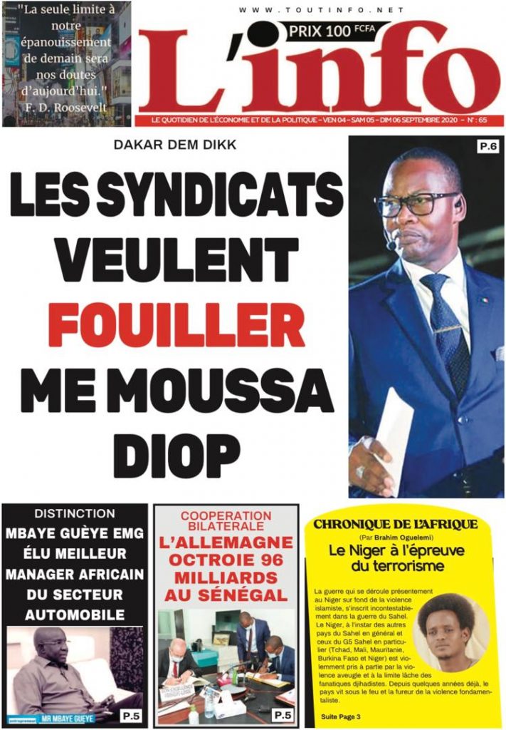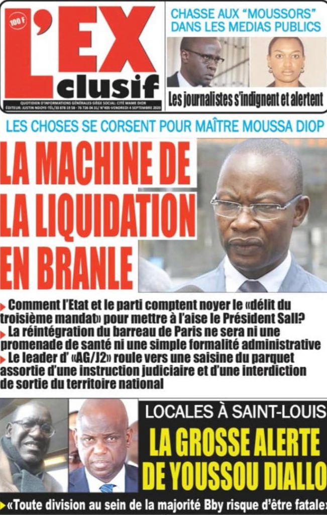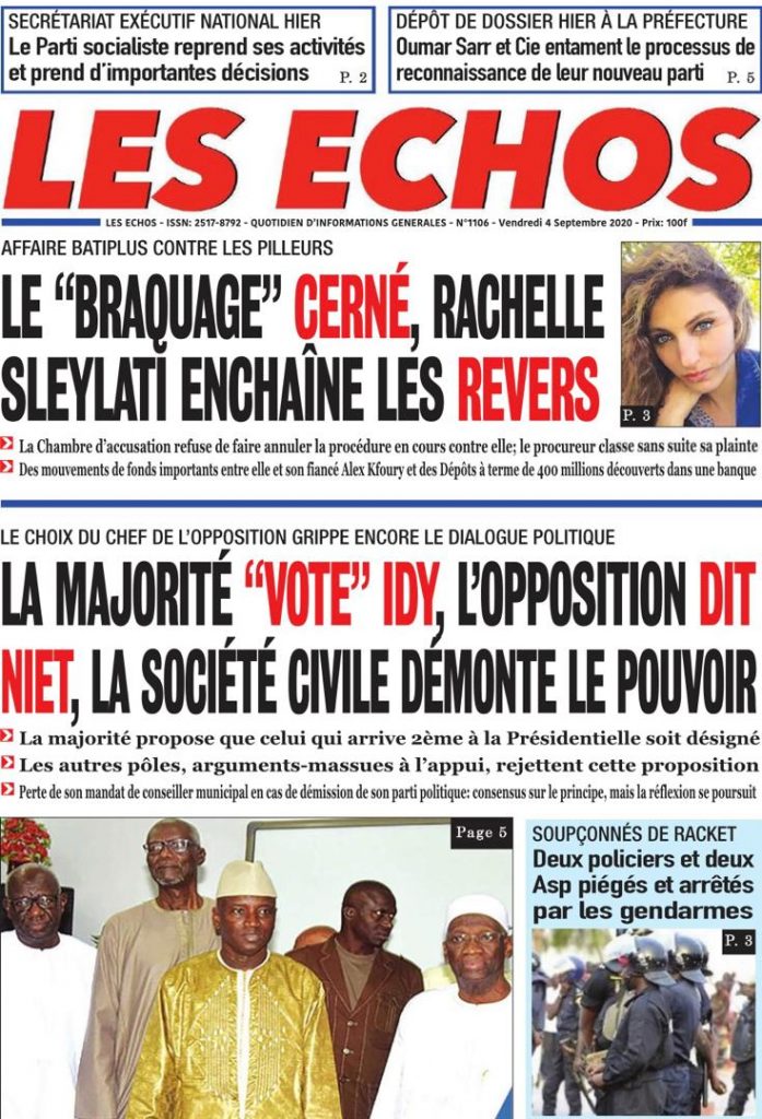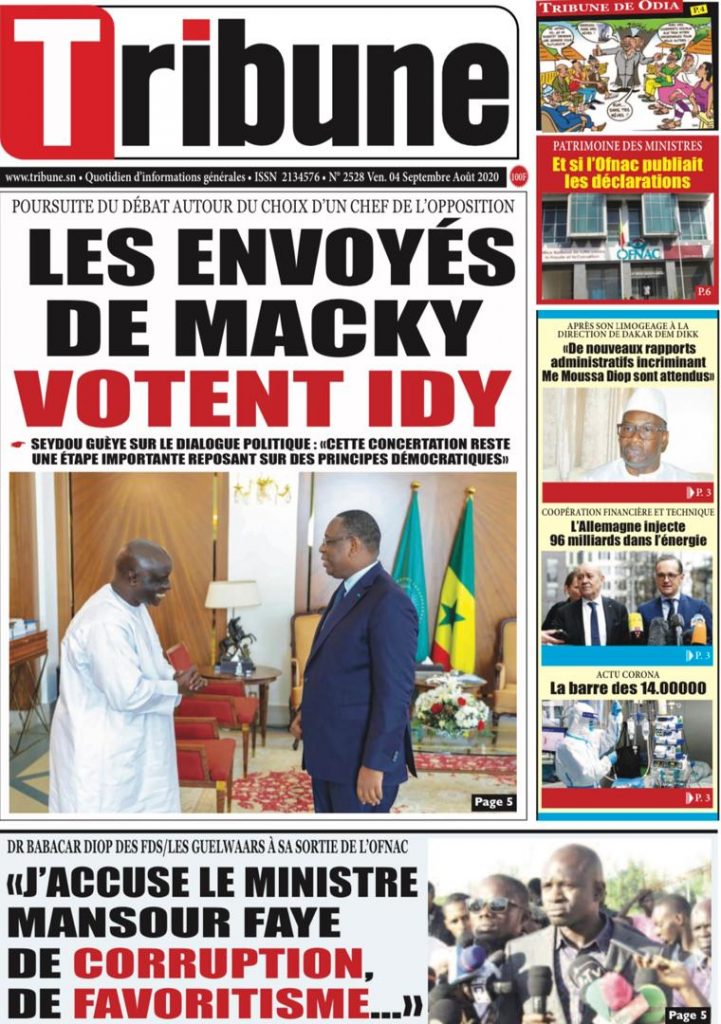 " /> La Une des Quotidiens Nationaux du Vendredi 04 Septembre 2020 Publié le 4 Sep, 2020 À DÉCOUVRIR Les Unes des quotidiens nationaux du 03 novembre 2025 3 Nov, 2025 Source : Ma Revue de presse par Mamadou Ly – rp221.comLIRE AUSSI La Une des Quotidiens Internationaux du Vendredi 04 Septembre 2020 Partager ->