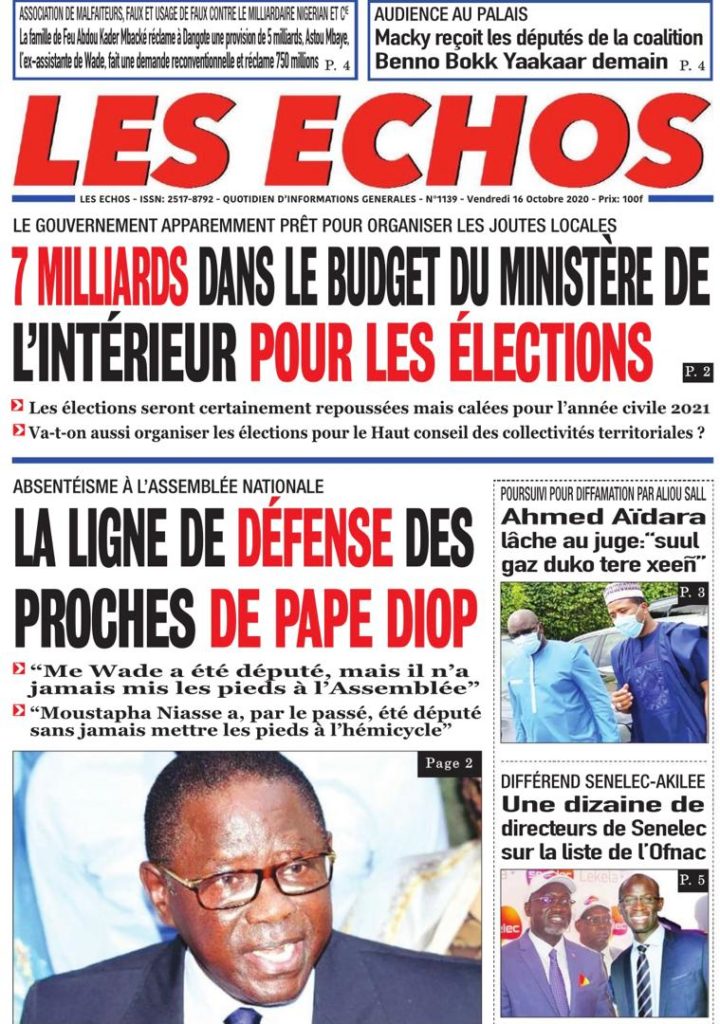 " /> La Une des Quotidiens Nationaux du Vendredi 16 Octobre 2020 Publié le 16 Oct, 2020 À DÉCOUVRIR Les Unes des quotidiens nationaux du 19 novembre 2025 19 Nov, 2025 Source : Ma Revue de presse par Mamadou Ly – rp221.com Partager ->