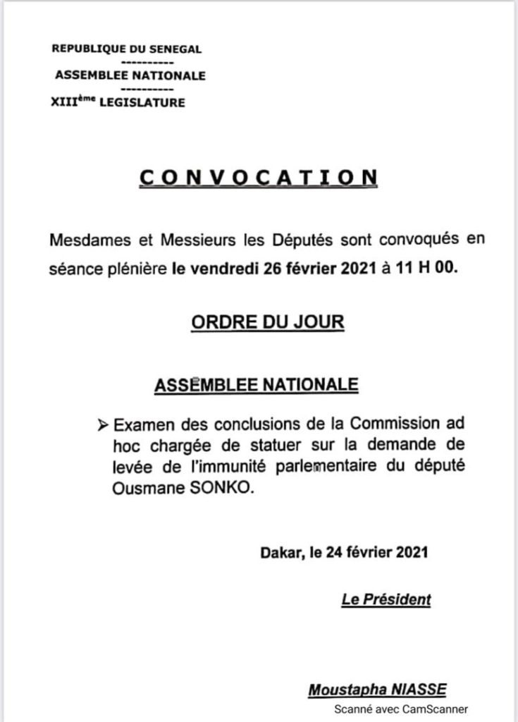 2- Assemblée nationale : Les députés convoqués pour la plénière consacrée à la procédure de levée de l’immunité parlementaire de leur collègue Ousmane Sonko