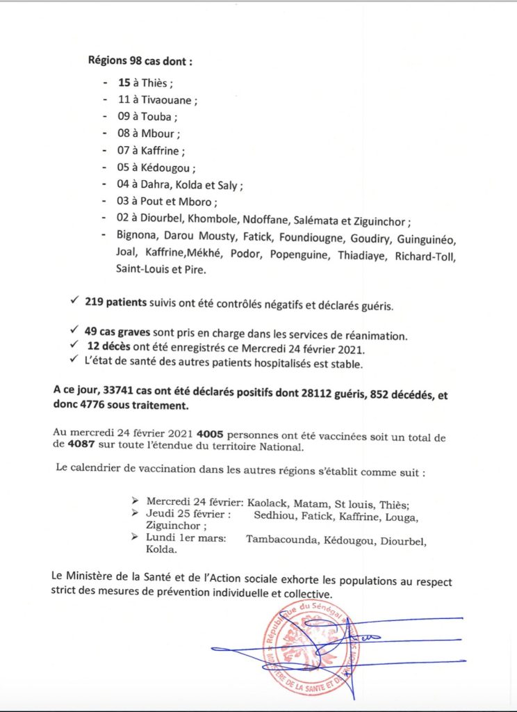 " /> Covid-19 au Sénégal : 288 cas positifs, 219 guéris, 4776 sous traitement Publié le 25 Fév, 2021 À DÉCOUVRIR Gestion des fonds Covid-19 : Le ministre de la Justice fait… 29 Juil, 2024 Communiqué N°361 du 25 février 2021 Partager ->