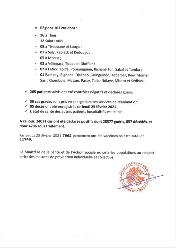 " /> Covid-19 au Sénégal : 290 cas positifs, 265 guéris, 4796 sous traitement Publié le 26 Fév, 2021 À DÉCOUVRIR Gestion des fonds Covid-19 : Le ministre de la Justice fait… 29 Juil, 2024 Communiqué N°362 du 26 février 2021 Partager ->
