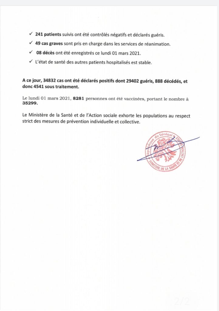 " /> Covid-19 au Sénégal : 100 cas positifs, 241 guéris, 4541 sous traitement Publié le 2 Mar, 2021 À DÉCOUVRIR Gestion des fonds Covid-19 : Le ministre de la Justice fait… 29 Juil, 2024 Communiqué N°366 du 02 Mars 2021 Partager ->