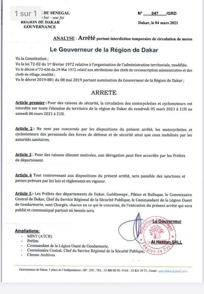 " /> Pour des raisons de sécurité, le Gouverneur de Dakar interdit la circulation des motocyclettes et cyclomoteurs sur l’étendue du territoire régional Publié le 5 Mar, 2021 À DÉCOUVRIR Communiqué du Conseil des ministres du mercredi 1er octobre… 2 Oct, 2025 Communiqué Partager ->