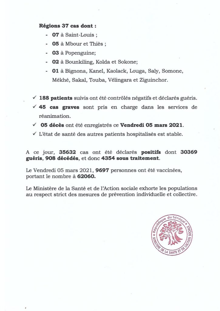 " /> Covid-19 au Sénégal : 164 cas positifs, 188 guéris, 4354 sous traitement Publié le 6 Mar, 2021 À DÉCOUVRIR Gestion des fonds Covid-19 : Le ministre de la Justice fait… 29 Juil, 2024 Communiqué N°370 du 06 Mars 2021 Partager ->