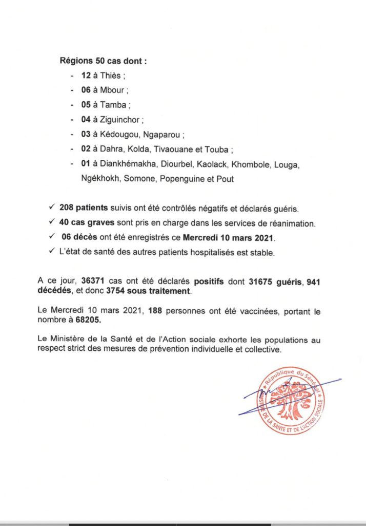 " /> Covid-19 au Sénégal : 176 cas positifs, 208 guéris, 3754 sous traitement Publié le 11 Mar, 2021 À DÉCOUVRIR Gestion des fonds Covid-19 : Le ministre de la Justice fait… 29 Juil, 2024 Communiqué N°375 du 11 Mars 2021 Partager ->