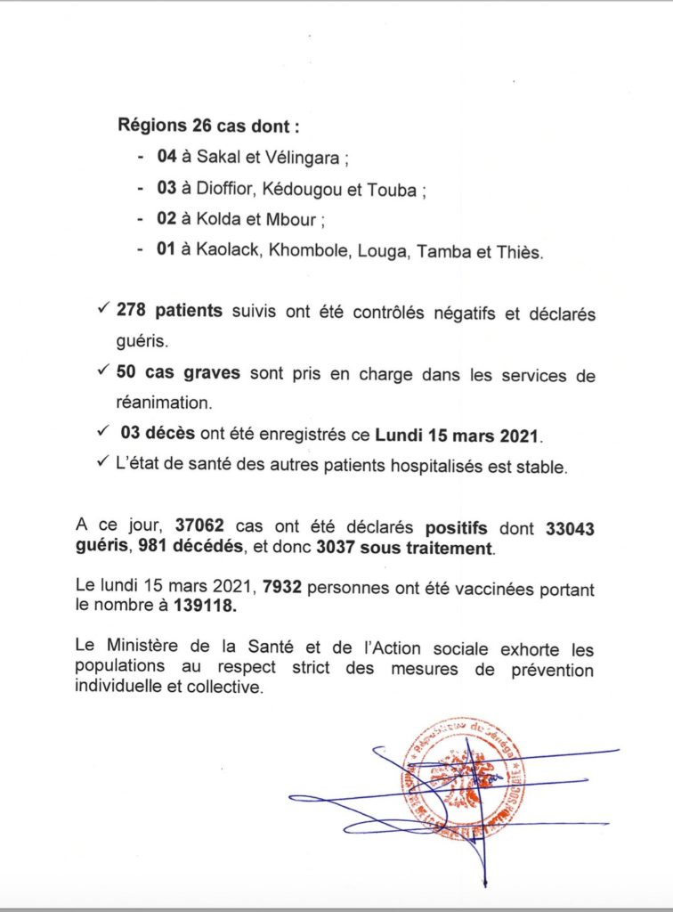 " /> Covid-19 au Sénégal : 66 cas positifs, 278 guéris, 3037 sous traitement Publié le 16 Mar, 2021 À DÉCOUVRIR Gestion des fonds Covid-19 : Le ministre de la Justice fait… 29 Juil, 2024 Communiqué N°380 du 16 Mars 2021 Partager ->
