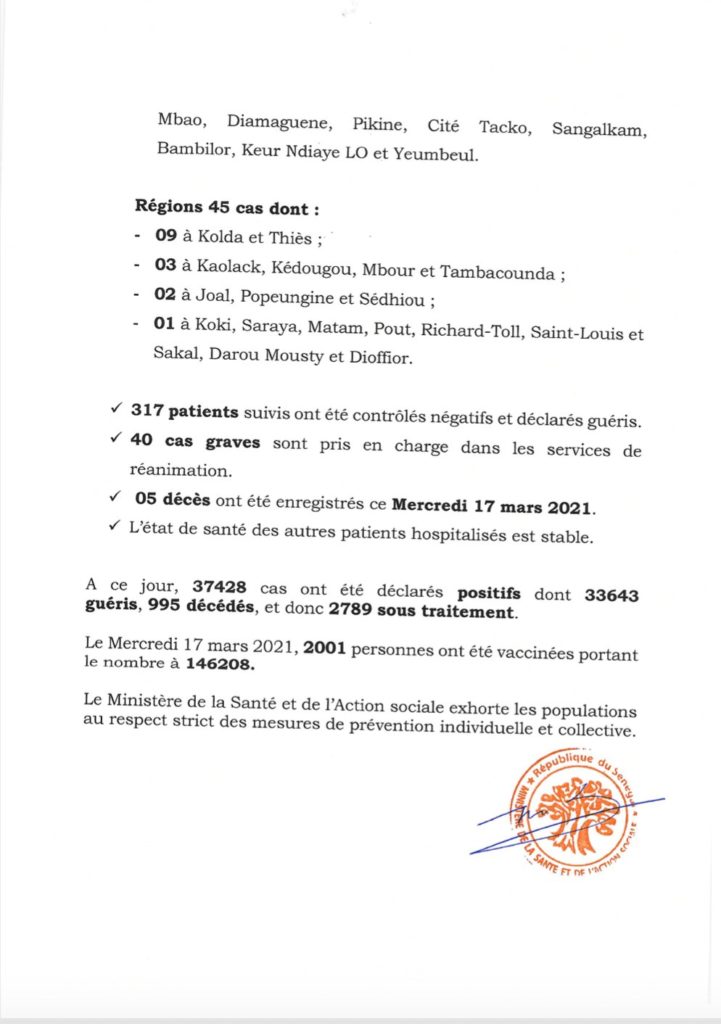 " /> Covid-19 au Sénégal : 174 cas positifs, 317 guéris, 2798 sous traitement Publié le 18 Mar, 2021 À DÉCOUVRIR Gestion des fonds Covid-19 : Le ministre de la Justice fait… 29 Juil, 2024 Communiqué N°382 du 18 Mars 2021 Partager ->
