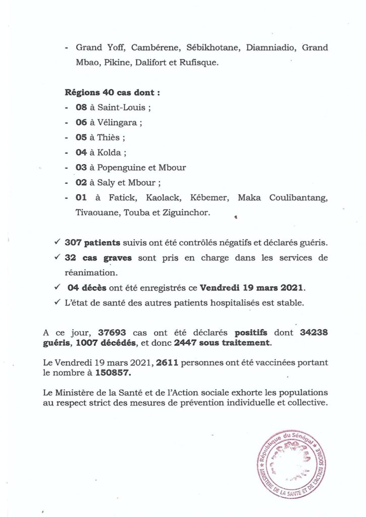 " /> Covid-19 au Sénégal : 152 cas positifs, 307 guéris, 2447 sous traitement Publié le 21 Mar, 2021 À DÉCOUVRIR Gestion des fonds Covid-19 : Le ministre de la Justice fait… 29 Juil, 2024 Communiqué N°385 du 21 Mars 2021 Partager ->