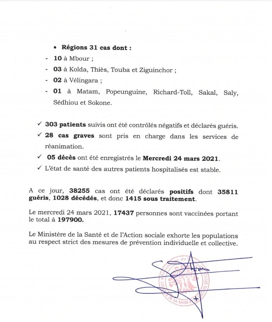" /> Covid-19 au Sénégal : 121 cas positifs, 303 guéris, 1415 sous traitement Publié le 25 Mar, 2021 À DÉCOUVRIR Gestion des fonds Covid-19 : Le ministre de la Justice fait… 29 Juil, 2024 Communiqué N°389 du 25 Mars 2021 Partager ->