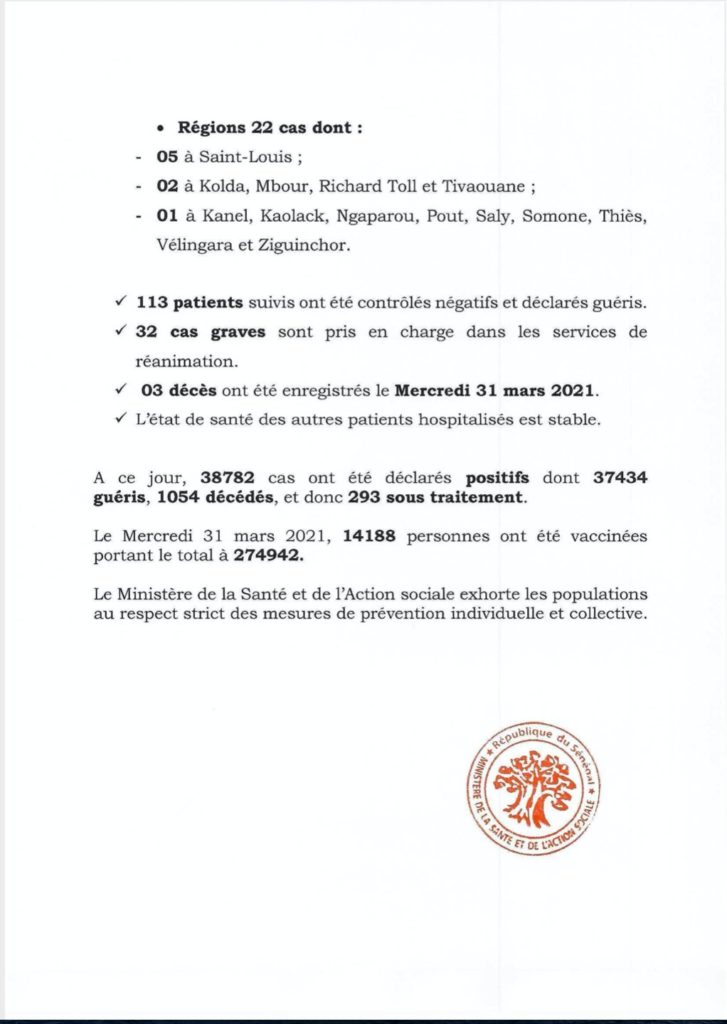" /> Covid-19 au Sénégal : 77 cas positifs, 113 guéris, 293 sous traitement Publié le 1 Avr, 2021 À DÉCOUVRIR Gestion des fonds Covid-19 : Le ministre de la Justice fait… 29 Juil, 2024 Communiqué N°396 du 1er Avril 2021 Partager ->
