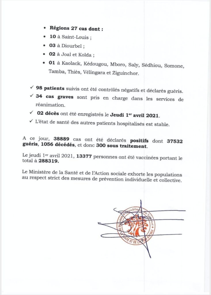 " /> Covid-19 au Sénégal : 107 cas positifs, 98 guéris, 300 sous traitement Publié le 2 Avr, 2021 À DÉCOUVRIR Gestion des fonds Covid-19 : Le ministre de la Justice fait… 29 Juil, 2024 Communiqué N°397 du 02 Avril 2021 Partager ->
