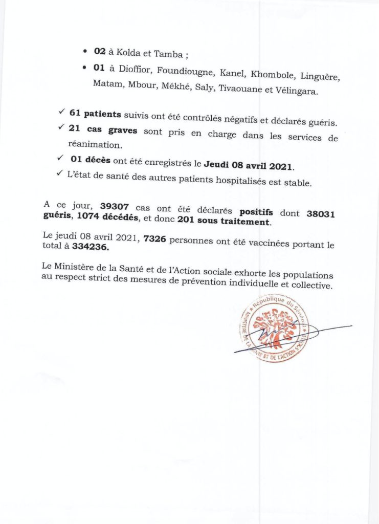 " /> Covid-19 au Sénégal : 70 cas positifs, 61 guéris, 201 sous traitement Publié le 9 Avr, 2021 À DÉCOUVRIR SenCaféActu du 01 décembre 2025 1 Déc, 2025 Communiqué N°404 du 09 Avril 2021 Partager ->