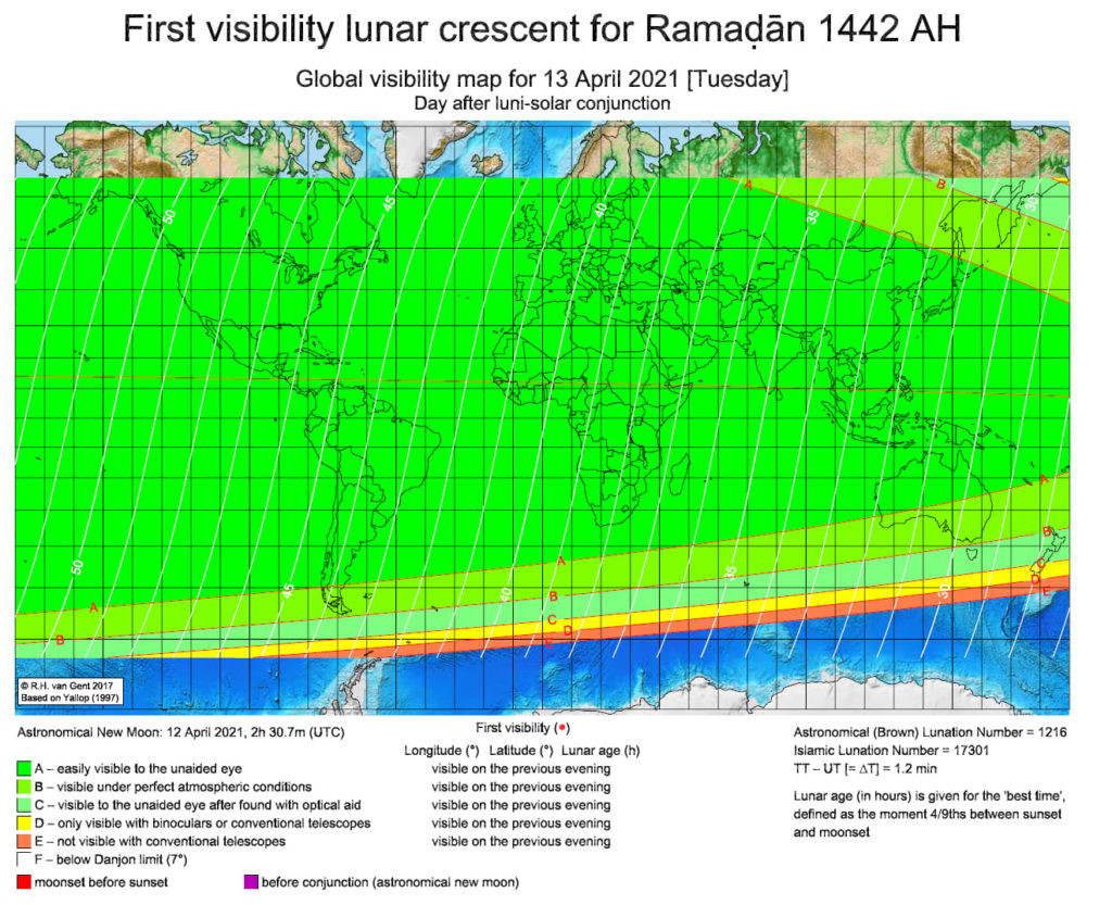 IMPORTANT : Le moment de la conjonction (02h31 du matin) risque d’imposer un démarrage à deux vitesses à travers le monde. Plusieurs pays en Asie, au Moyen Orient et en Europe prendront leur décision sur la base du calcul astronomique en se référant à la date de conjonction et non sur une observation visuelle pour démarrer le ramadan le 13 Avril (déjà annoncé pour certains). Les pays qui privilégient l’observation à l’œil nu, chercheront le croissant à partir du 12 Avril au soir avec un probable démarrage le 14 Avril. Certains pays d’Afrique de l’Ouest, avec une tradition du mois lunaire limité à 29 jours, pourraient également annoncer une observation du croissant le soir du 12 Avril.