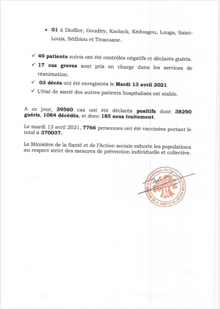 " /> Covid-19 au Sénégal : 65 cas positifs, 49 guéris, 185 sous traitement Publié le 14 Avr, 2021 À DÉCOUVRIR Gestion des fonds Covid-19 : Le ministre de la Justice fait… 29 Juil, 2024 Communiqué N°409 du 14 Avril 2021 Partager ->