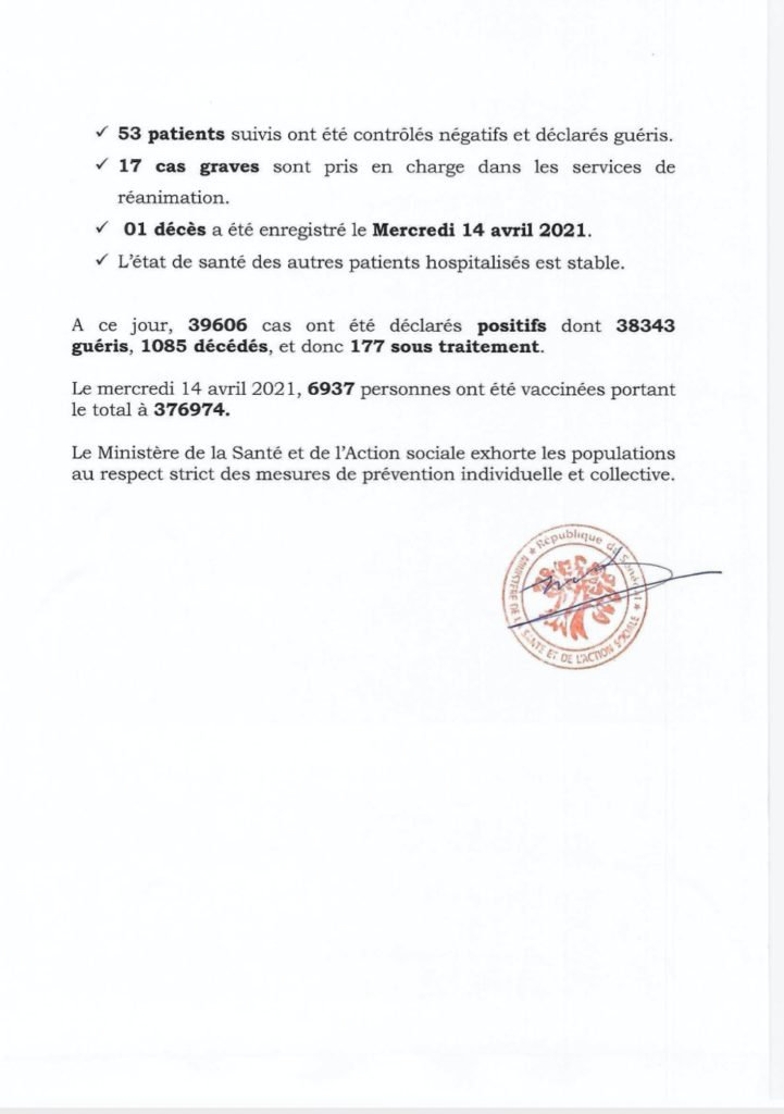 " /> Covid-19 au Sénégal : 46 cas positifs, 53 guéris, 177 sous traitement Publié le 15 Avr, 2021 À DÉCOUVRIR Gestion des fonds Covid-19 : Le ministre de la Justice fait… 29 Juil, 2024 Communiqué N°410 du 15 Avril 2021 Partager ->