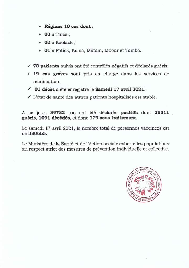 " /> Covid-19 au Sénégal : 51 cas positifs, 70 guéris, 179 sous traitement Publié le 18 Avr, 2021 À DÉCOUVRIR Gestion des fonds Covid-19 : Le ministre de la Justice fait… 29 Juil, 2024 Communiqué N°413 du 18 Avril 2021 Partager ->