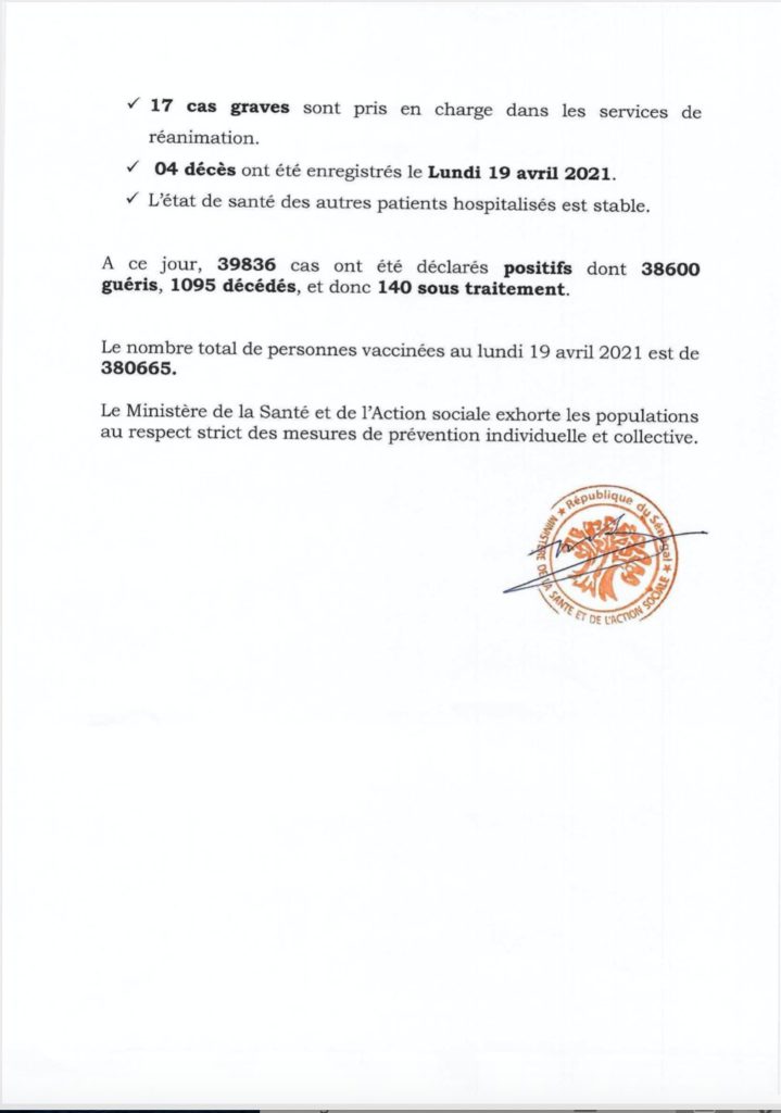 " /> Covid-19 au Sénégal : 15 cas positifs, 17 guéris, 140 sous traitement Publié le 20 Avr, 2021 À DÉCOUVRIR Gestion des fonds Covid-19 : Le ministre de la Justice fait… 29 Juil, 2024 Communiqué N°415 du 20 Avril 2021 Partager ->