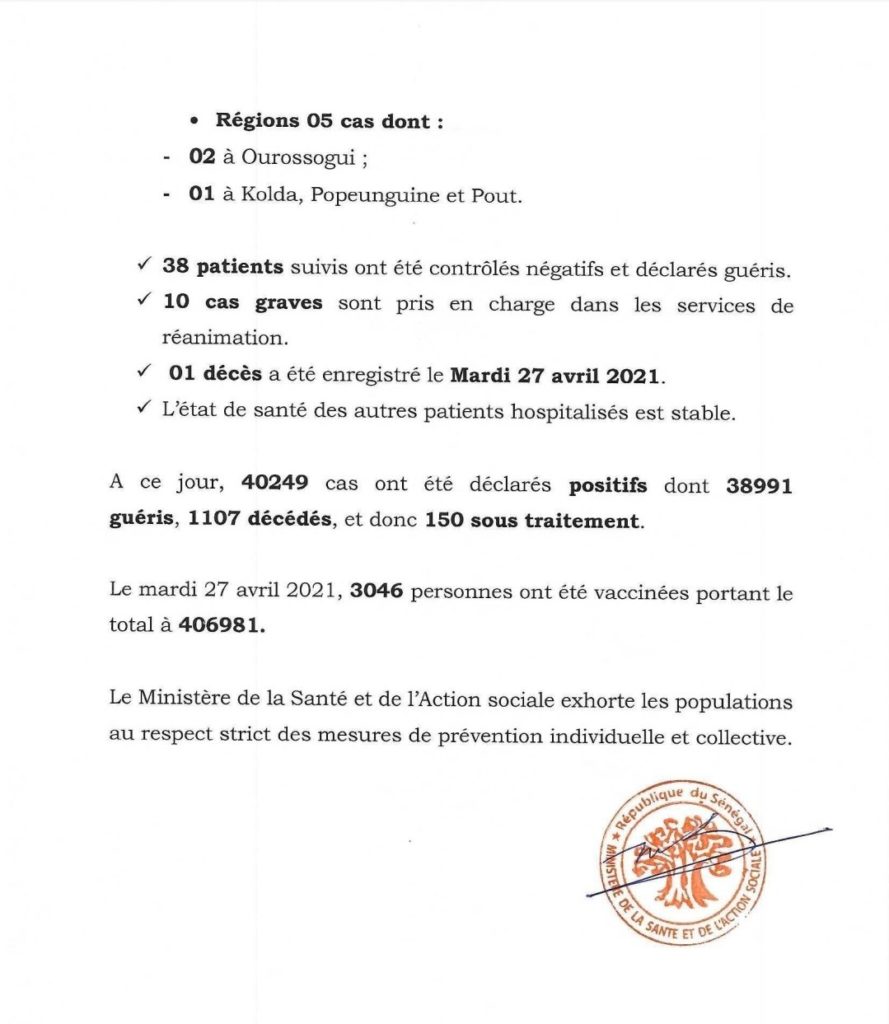 " /> Covid-19 au Sénégal : 56 cas positifs, 38 guéris, 150 sous traitement Publié le 28 Avr, 2021 À DÉCOUVRIR Gestion des fonds Covid-19 : Le ministre de la Justice fait… 29 Juil, 2024 Communiqué N°423 du 28 Avril 2021 Partager ->