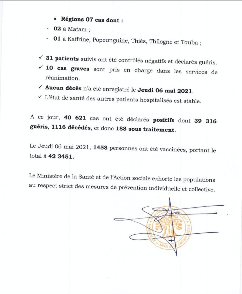 " /> Covid-19 au Sénégal : 43 cas positifs, 31 guéris, 188 sous traitement Publié le 7 Mai, 2021 À DÉCOUVRIR Gestion des fonds Covid-19 : Le ministre de la Justice fait… 29 Juil, 2024 Communiqué N°432 du 07 Mai 2021 Partager ->