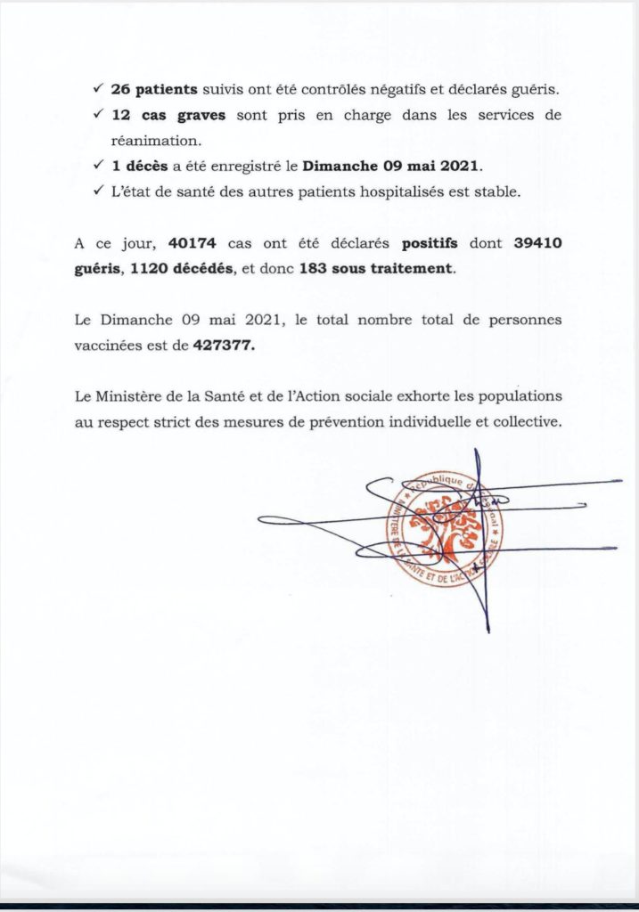 " /> Covid-19 au Sénégal : 22 cas positifs, 26 guéris, 183 sous traitement Publié le 10 Mai, 2021 À DÉCOUVRIR Gestion des fonds Covid-19 : Le ministre de la Justice fait… 29 Juil, 2024 Communiqué N° 435 du 10 Mai 2021 Partager ->