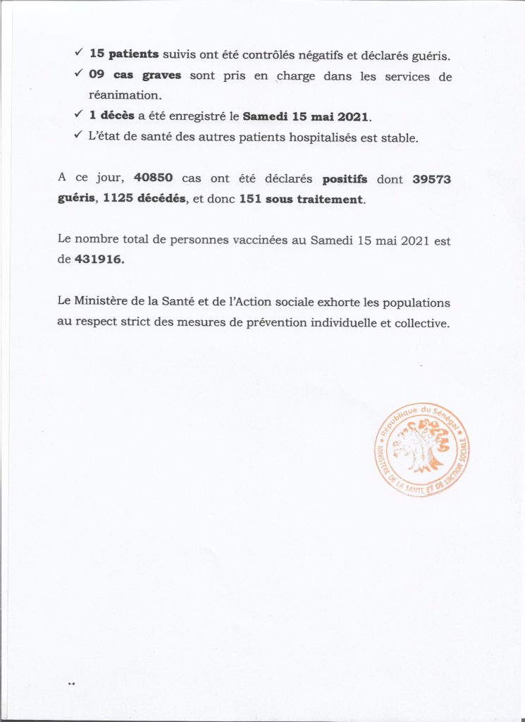 " /> Covid-19 au Sénégal : 22 cas positifs, 15 guéris, 151 sous traitement Publié le 16 Mai, 2021 À DÉCOUVRIR Gestion des fonds Covid-19 : Le ministre de la Justice fait… 29 Juil, 2024 Communiqué N°441 du 16 Mai 2021 Partager ->