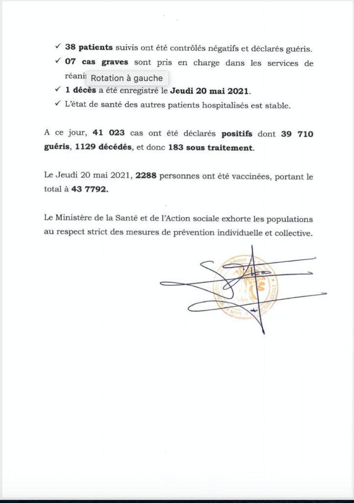 " /> Covid-19 au Sénégal : 62 cas positifs, 38 guéris, 183 sous traitement Publié le 21 Mai, 2021 À DÉCOUVRIR Gestion des fonds Covid-19 : Le ministre de la Justice fait… 29 Juil, 2024 Communiqué N°446 du 21 Mai 2021 Partager ->