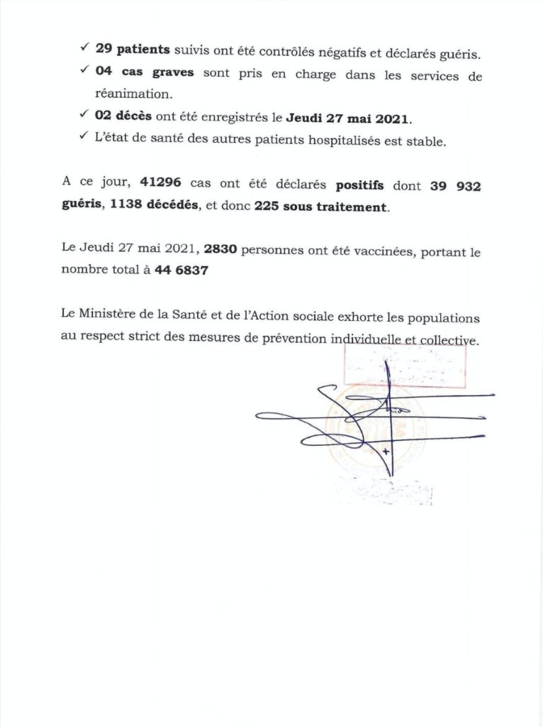 " /> Covid-19 au Sénégal : 48 cas positifs, 29 guéris, 225 sous traitement Publié le 28 Mai, 2021 À DÉCOUVRIR Gestion des fonds Covid-19 : Le ministre de la Justice fait… 29 Juil, 2024 Communiqué N°453 du 28 Mai 2021 Partager ->