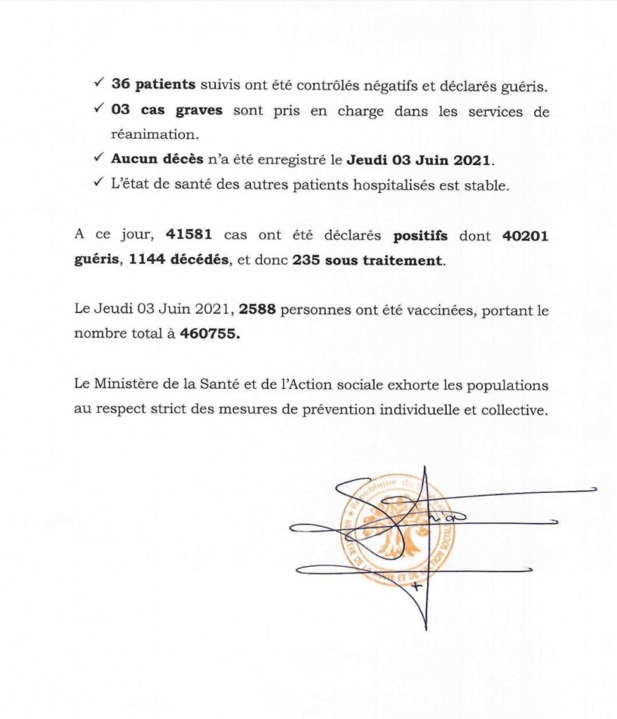 " /> Covid-19 au Sénégal : 42 cas positifs, 36 guéris, 235 sous traitement Publié le 4 Juin, 2021 À DÉCOUVRIR Gestion des fonds Covid-19 : Le ministre de la Justice fait… 29 Juil, 2024 Communiqué N°460 du 04 juin 2021 Partager ->