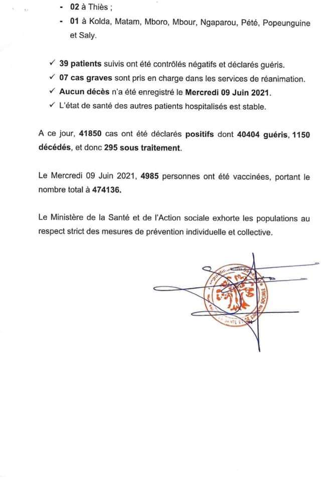 " /> Covid-19 au Sénégal : 54 cas positifs, 39 guéris, 295 sous traitement Publié le 10 Juin, 2021 À DÉCOUVRIR Gestion des fonds Covid-19 : Le ministre de la Justice fait… 29 Juil, 2024 Communiqué N°466 du 10 Juin 2021 Partager ->