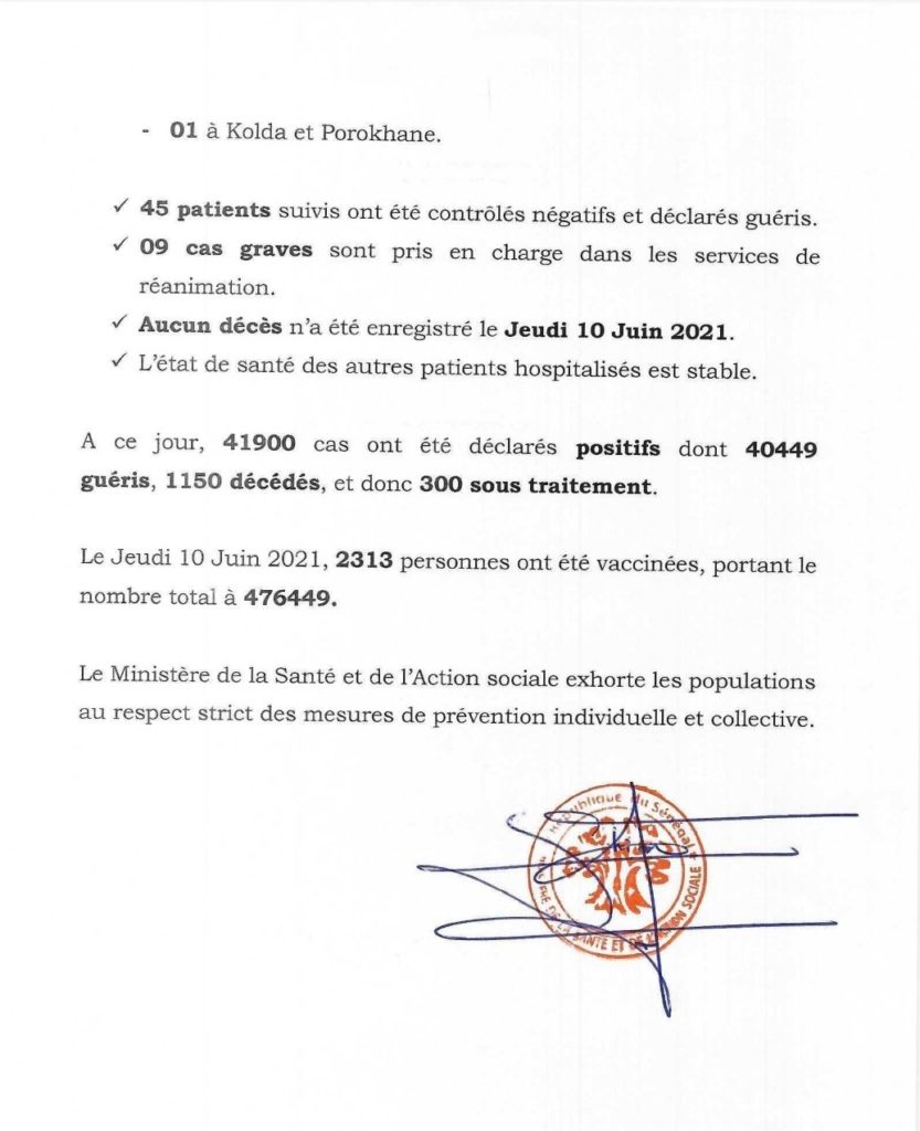 " /> Covid-19 au Sénégal : 50 cas positifs, 45 guéris, 300 sous traitement Publié le 11 Juin, 2021 À DÉCOUVRIR Gestion des fonds Covid-19 : Le ministre de la Justice fait… 29 Juil, 2024 Communiqué N°467 du 11 Juin 2021 Partager ->