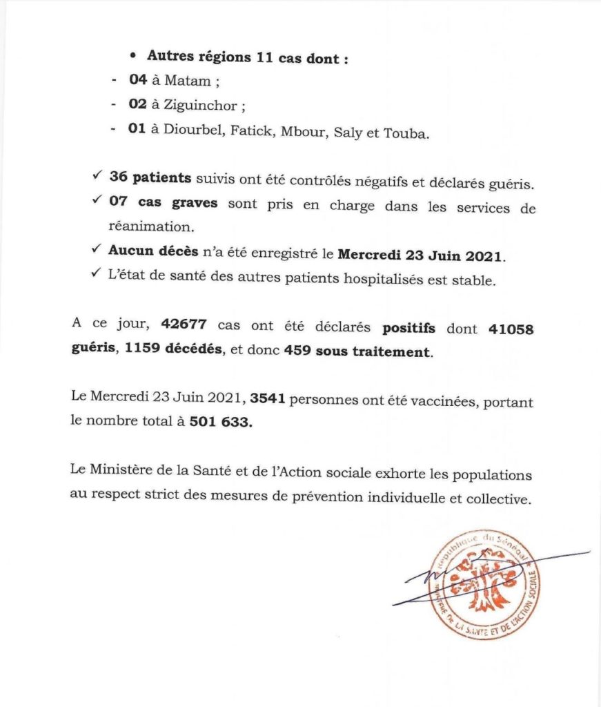 " /> Covid-19 au Sénégal : 87 cas positifs, 36 guéris, 459 sous traitement Publié le 24 Juin, 2021 À DÉCOUVRIR Gestion des fonds Covid-19 : Le ministre de la Justice fait… 29 Juil, 2024 Communiqué N°480 du 24 Juin 2021 Partager ->