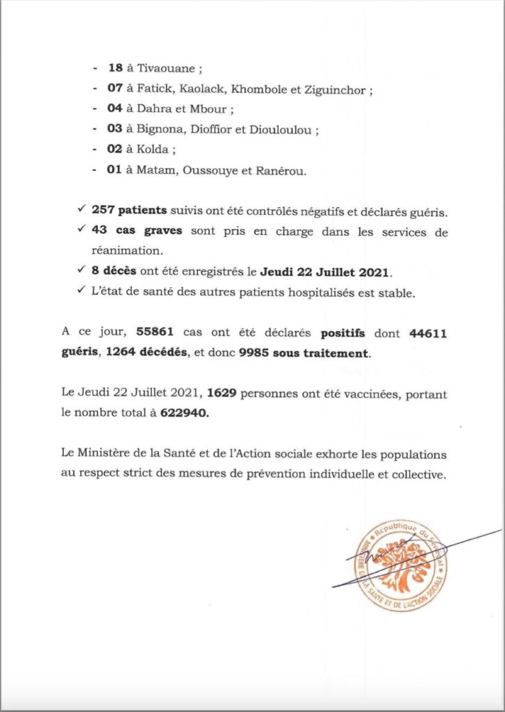 " /> Covid-19 au Sénégal : 1041 cas positifs, 257 guéris, 9985 sous traitement Publié le 23 Juil, 2021 À DÉCOUVRIR Gestion des fonds Covid-19 : Le ministre de la Justice fait… 29 Juil, 2024 Communiqué N°509 du 23 Juillet 2021 Partager ->
