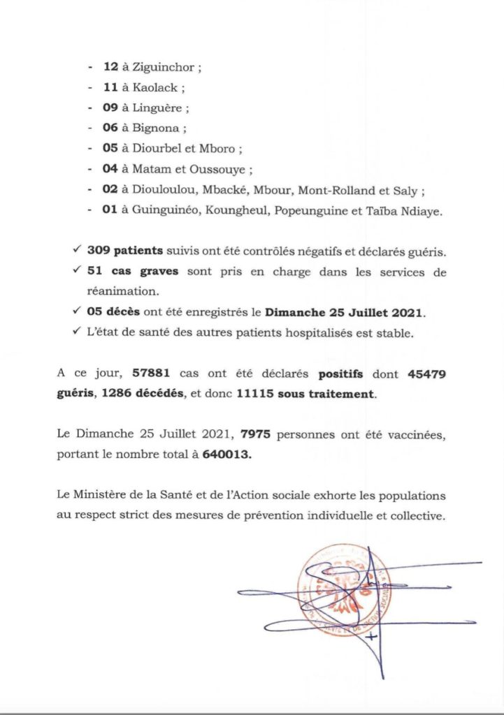 " /> Covid-19 au Sénégal : 618 cas positifs, 309 guéris, 1115 sous traitement Publié le 26 Juil, 2021 À DÉCOUVRIR Gestion des fonds Covid-19 : Le ministre de la Justice fait… 29 Juil, 2024 Communiqué N°512 du 26 Juillet 2021 Partager ->