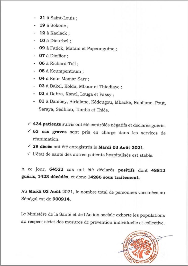 " /> Covid-19 au Sénégal : 29 décès, 498 cas positifs, 14 286 sous traitement Publié le 4 Août, 2021 À DÉCOUVRIR Gestion des fonds Covid-19 : Le ministre de la Justice fait… 29 Juil, 2024 Communiqué N°521 du 04 Août 2021 Partager ->