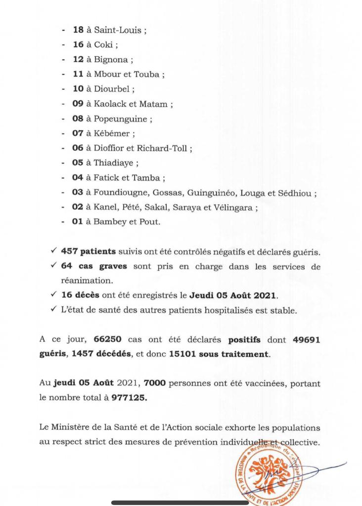 " /> Pandémie covid-19 / Sénégal : Communiqué 523 Publié le 6 Août, 2021 À DÉCOUVRIR Les Unes des quotidiens nationaux du 04 novembre 2025 4 Nov, 2025 4471 Tests917 Nouveaux cas 16 Décès64 Cas graves15101 Sous traitement970.125 vaccins Partager ->
