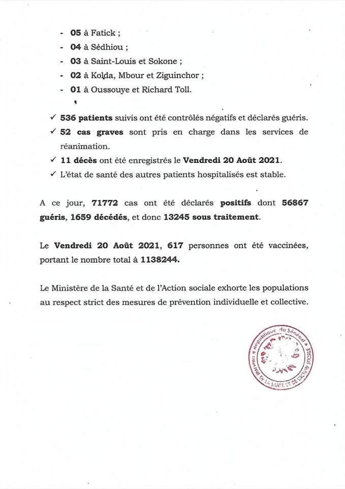 " /> Covid-19 : 144 cas et 11 décès Publié le 21 Août, 2021 À DÉCOUVRIR Communiqué du Conseil des ministres du mercredi 12 novembre… 12 Nov, 2025 Partager ->