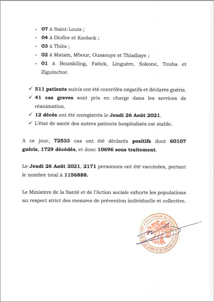 " /> Covid-19 : 218 cas et 12 décès Publié le 27 Août, 2021 À DÉCOUVRIR Communiqué du Conseil des ministres du mercredi 1er octobre… 2 Oct, 2025 Partager ->