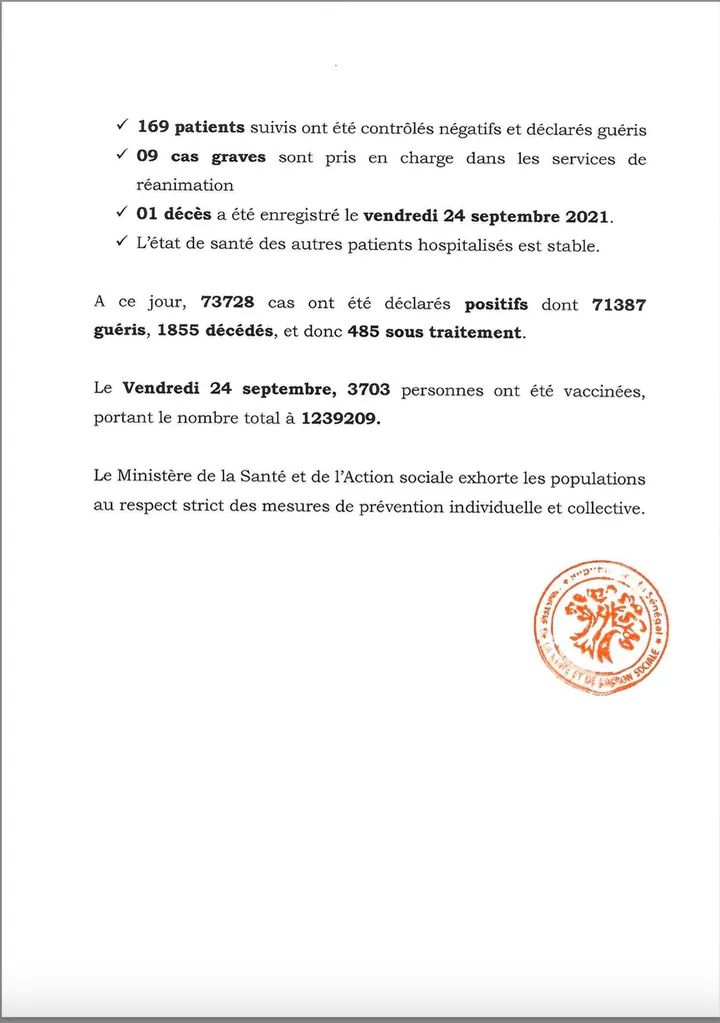 " /> Covid-19 : 09 cas positifs, 01 décès, 09 cas graves et 485 sous traitement Publié le 25 Sep, 2021 À DÉCOUVRIR Communiqué du Conseil des ministres du mercredi 1er octobre… 2 Oct, 2025 La rédaction de SenCaféActu Partager ->