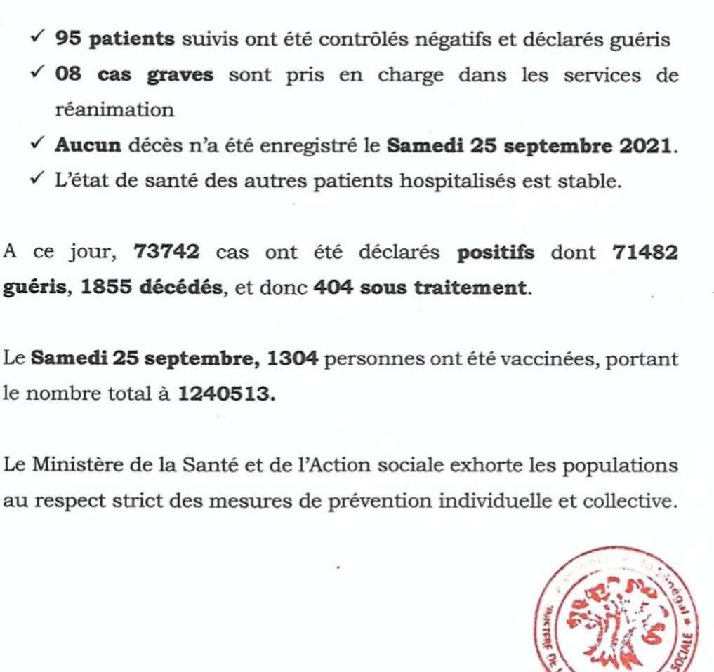 " /> Covid-19 : 14 cas positifs, aucun décès, 08 cas graves et 404 sous traitement Publié le 26 Sep, 2021 À DÉCOUVRIR Communiqué du Conseil des ministres du mercredi 1er octobre… 2 Oct, 2025 La rédaction de SenCaféActu Partager ->