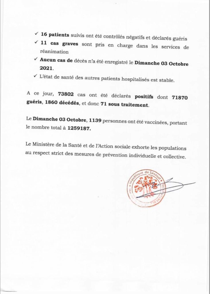 " /> Covid-19 : 02 cas positifs, aucun décès, 11 cas graves et 71 sous traitement Publié le 4 Oct, 2021 À DÉCOUVRIR Communiqué du Conseil des ministres du mercredi 12 novembre… 12 Nov, 2025 Partager ->