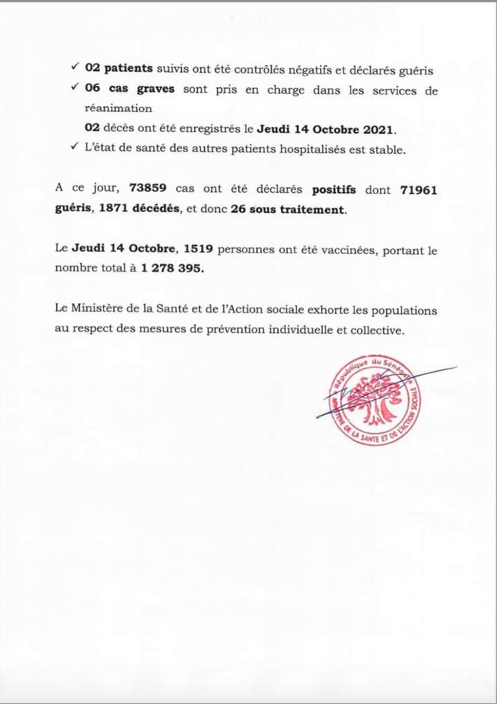 " /> Covid-19 : 06 cas positifs, 02 décès, 06 cas graves et 26 sous traitement Publié le 15 Oct, 2021 À DÉCOUVRIR Communiqué du Conseil des ministres du mercredi 1er octobre… 2 Oct, 2025 Partager ->