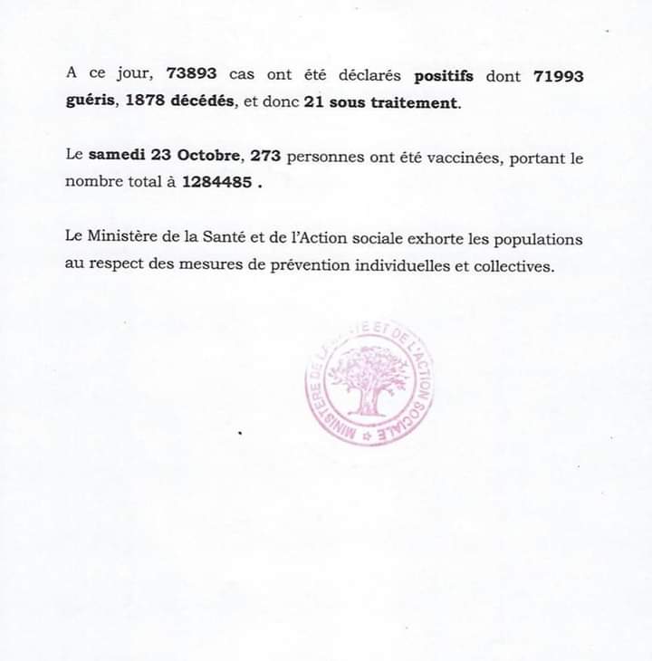 " /> Covid-19 : 02 cas positif, 01 décès, 02 cas graves et 21 sous traitement Publié le 24 Oct, 2021 À DÉCOUVRIR Communiqué du Conseil des ministres du mercredi 1er octobre… 2 Oct, 2025 La rédaction de SenCaféActu Partager ->