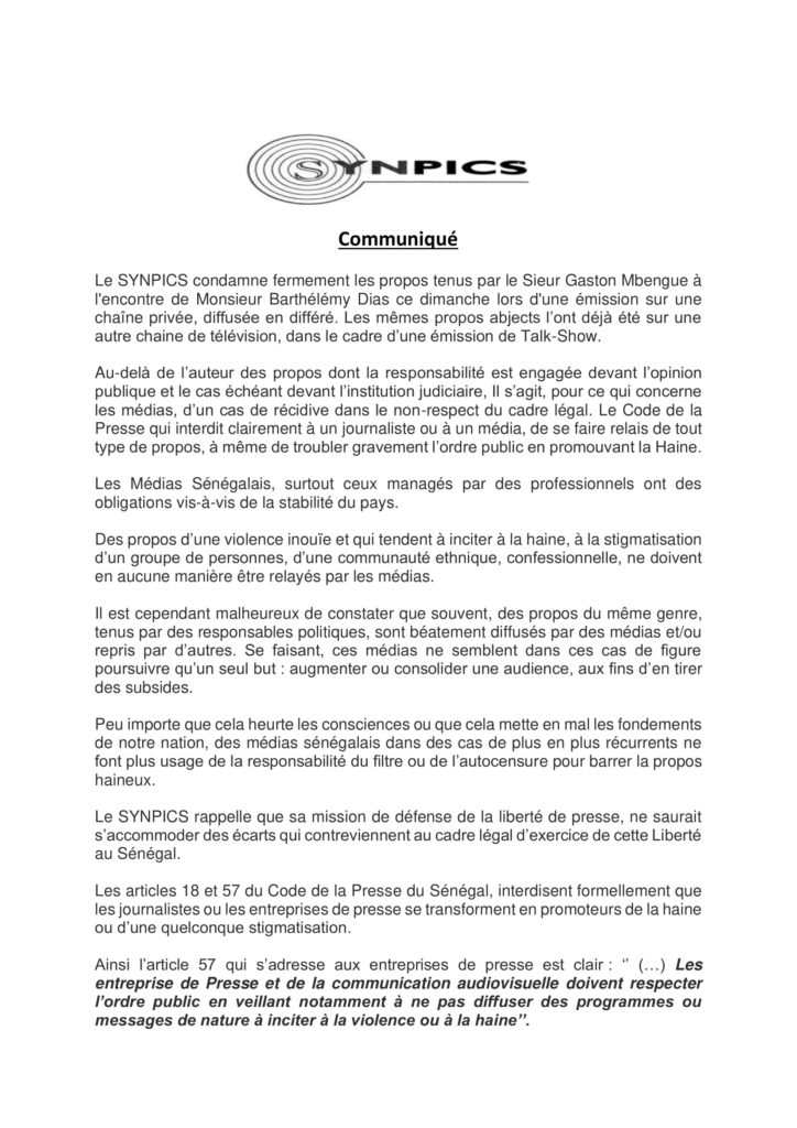 4- Propos de Gaston Mbengue : Le Synpics condamne et met en garde les médias